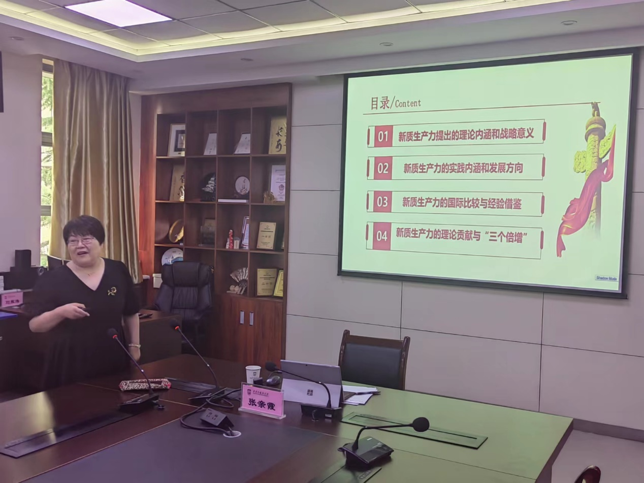 会议第二阶段由马克思主义学院院长张亲霞教授做“以新质生产力,促进高质量发展”专题辅导报告。报告围绕习近平总书记首次提出新质生产力、什么是新质生产力、怎么发展新质生产力这一主线,从“新质生产力提出的内涵和战略意义”“新质生产力的实践内涵和发展方向”“新质生产力的国际比较与经验借鉴”“新质生产力的理论贡献与三个倍增”四个部分讲述了发展新质生产力是推动高质量发展的内在要求和重要着力点,必须继续做好科技创新和管理创新,推动新质生产力加快发展。