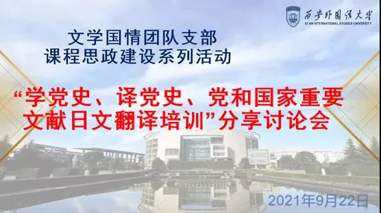 2021年 8 月 21 日人民中国杂志社以腾讯会议直播的方式主办“党和国家重要文献日文翻译”培训活动,日文学院文学国情团队支部派出吴少华、段笑晔、高扬、刘天羽四位同志参加了此次培训。9月22日中午,文学国情团队支部在E306“党员之家”召开培训内容分享讨论会,支部全体成员参加会议,由支部书记吴少华主持。