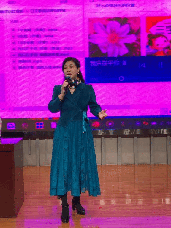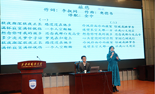 此后,潘幽燕老师深情演唱了中文歌曲《送别》(李叔同填词)、《旅愁》(金中译配)及日文歌曲《旅愁》(犬童球溪填词)。她向在场师生介绍了演唱过程中调节气息的技巧,并在现场互动的同时解释了以上歌曲所表达的情感。