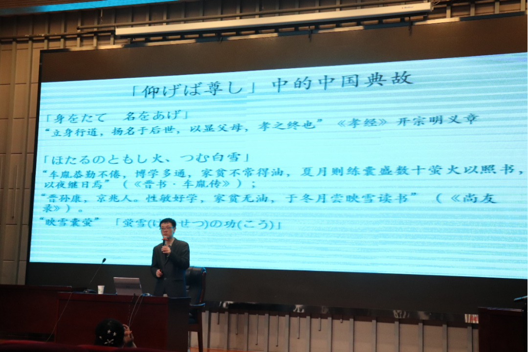 金中教授介绍了日文歌曲《仰げば尊し》及其中的中国典故,并发表了自己的见解。他认为,「仰げば尊し」(仰之则尊)暗用了颜回对孔子的赞美“仰之弥高,钻之弥坚,瞻之在前,忽焉在后。”(《论语·子罕》),「仰げば 尊し 我が師の恩」译为“仰之弥高,钻之弥坚,先生恩重如山”。此后,潘幽燕老师为在场师生演唱了日文版歌曲《仰げば尊し》及金中教授译配的中文版本《毕业歌》。