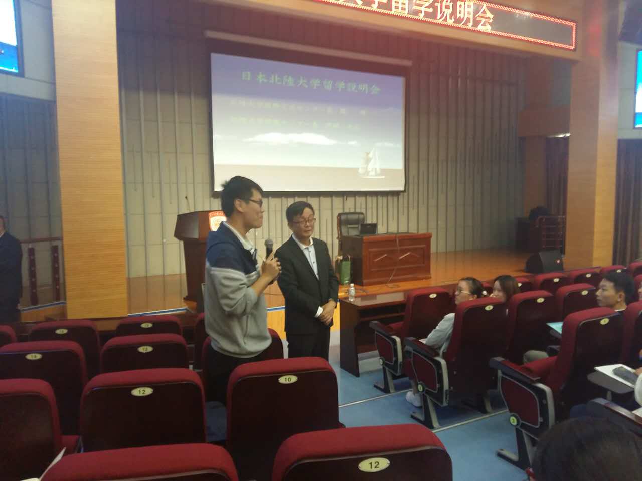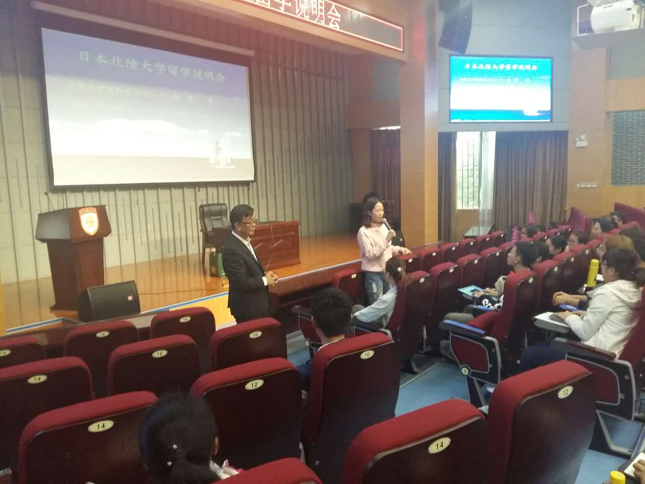 伴随着同学们热烈的掌声,阿部中心长热情洋溢地介绍了北陆大学的地理位置、交通以及北陆学子的毕业去向。之后,周晴老师从北陆大学的地理、自然环境、生活费、学校活动、学校设施、学校福利、医疗保险、住宿、考研情况等方面进行了详细说明。并与在场的同学们展开互动,同学们积极参与,会场气氛热烈,掌声、笑声此起彼伏。