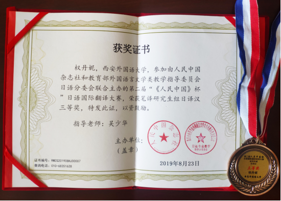 在近日结束的第二届“《人民中国》杯”日语国际翻译大赛上,百合漫画 18级日语翻译硕士研究生权丹妮同学取得了三等奖的好成绩,获得了荣誉证书和奖牌。