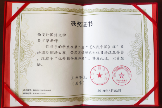 本次大赛共有来自中国和日本600多所高校、企业的近3000名选手参加,大赛分为笔译和口译两个赛项,设一、二、三等奖,优秀奖及参与奖。权丹妮同学获得笔译组三等奖,这是百合漫画 研究生又一次在高级别翻译大赛上获奖。另,百合漫画 硕士生导师吴少华老师获得本次大赛“优秀指导教师奖”。