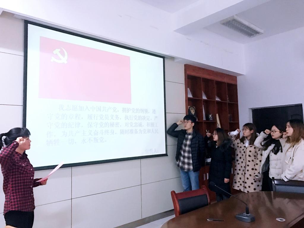 大会第二项讨论了白雪、杨家慧等5名发展对象的入党问题。5名同志分别宣读了《入党志愿书》,向党组织汇报了自己对党的认识、入党动机、本人履历以及其它相关问题。入党介绍人就发展对象的政治表现、考察培养和政治审查情况向大会进行了报告,与会党员按照党员标准并结合他们日常表现进行了充分讨论,经与会正式党员举手表决,一致同意接收白雪等5名发展对象加入中国共产党。雷雨老师代表支部委员会宣读了大会决议,支部委员魏海迪同志带领本次发展的预备党员面向党旗进行了庄严宣誓。