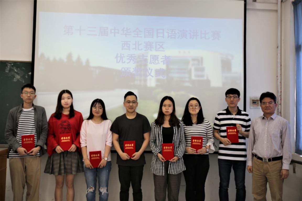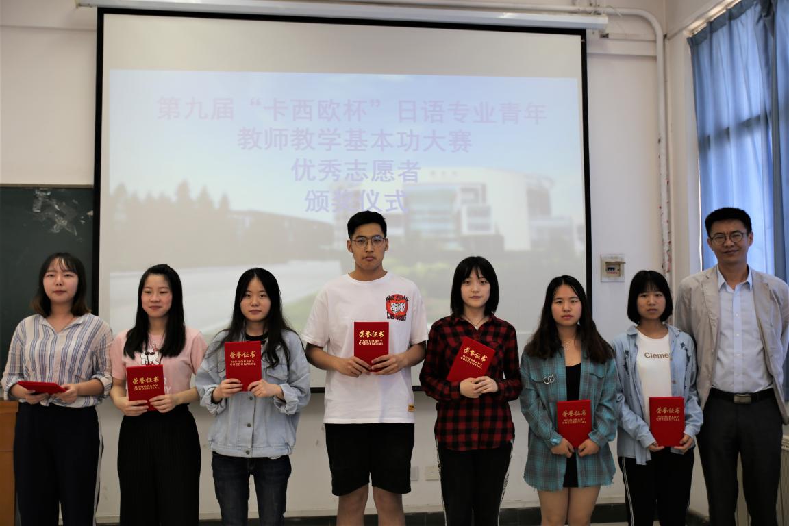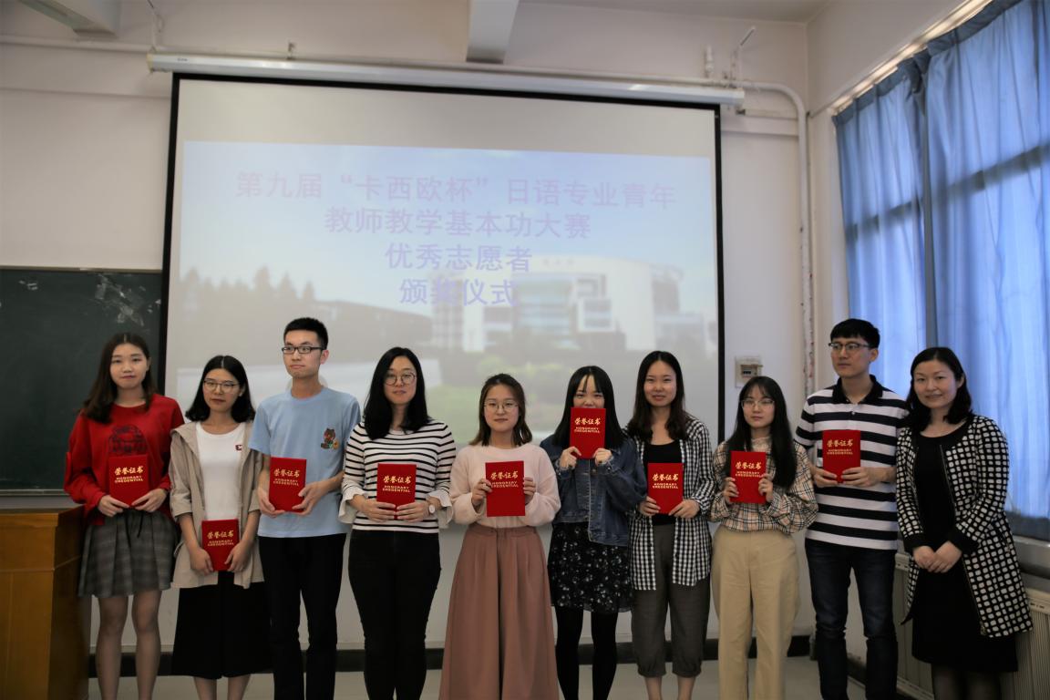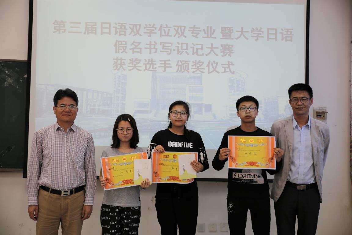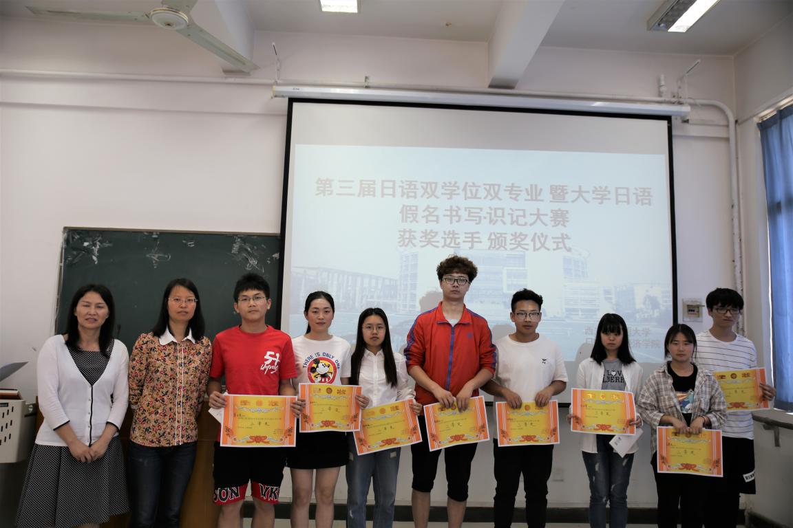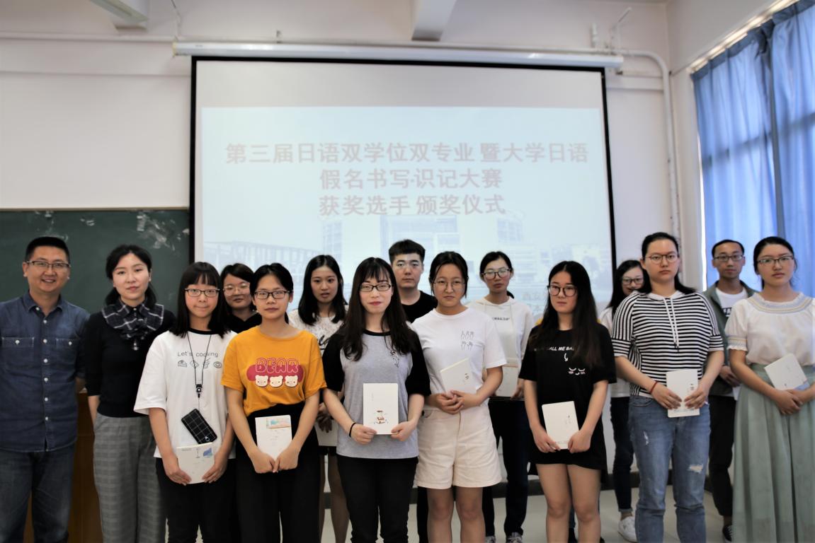 最后各位老师为“第三届日语双学位双专业暨大学日语假名书写识记大赛”获奖选手、以及“第十三届中华全国日语演讲比赛”和“第九届卡西欧杯日语专业青年教师教学基本功大赛”的优秀志愿者颁奖并合影留念。