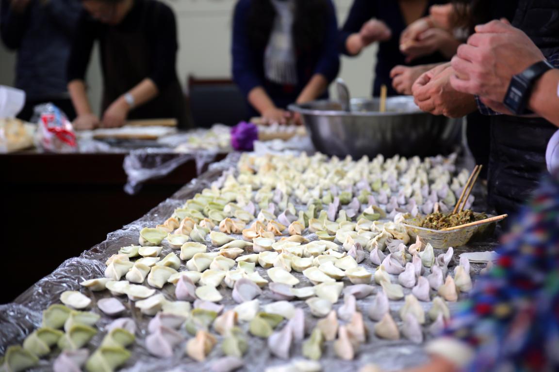 日文学院全体教职工开始投入到包饺子的整体环节中,择菜、和面、拌馅、包饺等等,每个环节都井然有序;一个个色泽亮丽、饱满的饺子呈现在案板之上;在色香味俱全的“饕餮盛宴”下,全体教职工话一年收获,品一年总结,寄一年新希望。