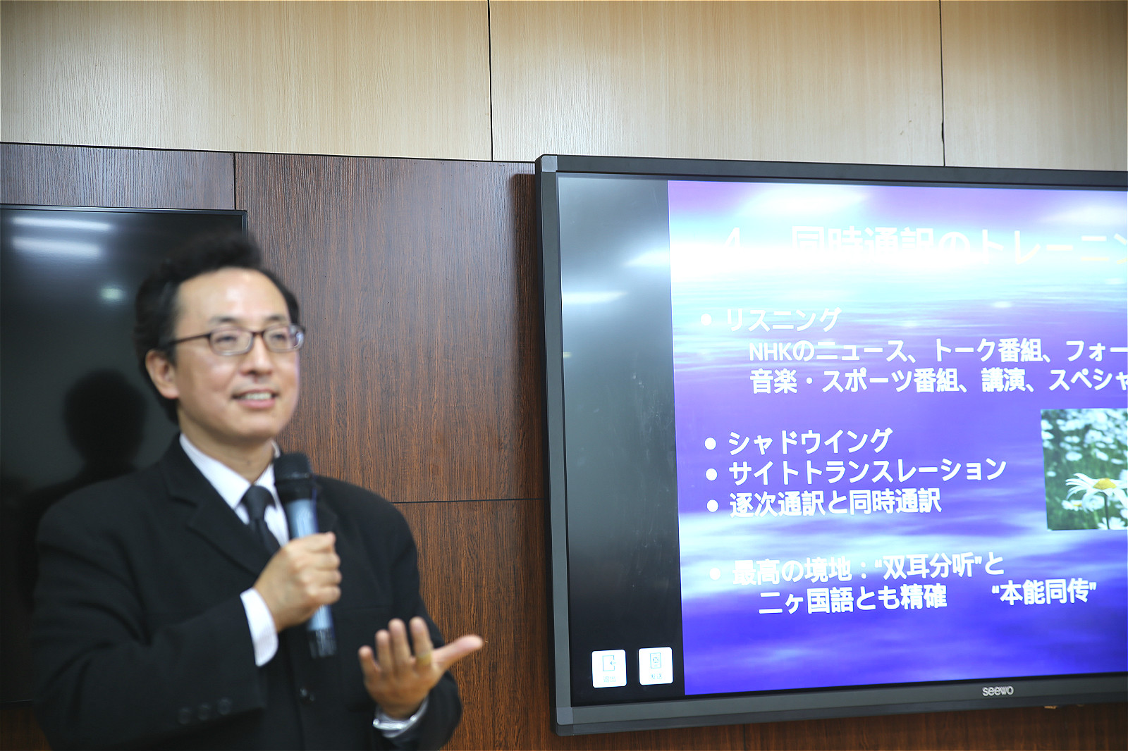 最后,宋协毅教授就当前大多同声传译工作中存在的问题提出了解决方案。他指出在同声传译中,词组构造存在较多问题,如场合使用不当、助词使用不当等。随即宋协毅教授给出了建议:翻译者应不断提高中日两种语言合理互通使用的能力、注意文中副词等特殊词的使用,合理利用日语句型加强对全文的整体理解。