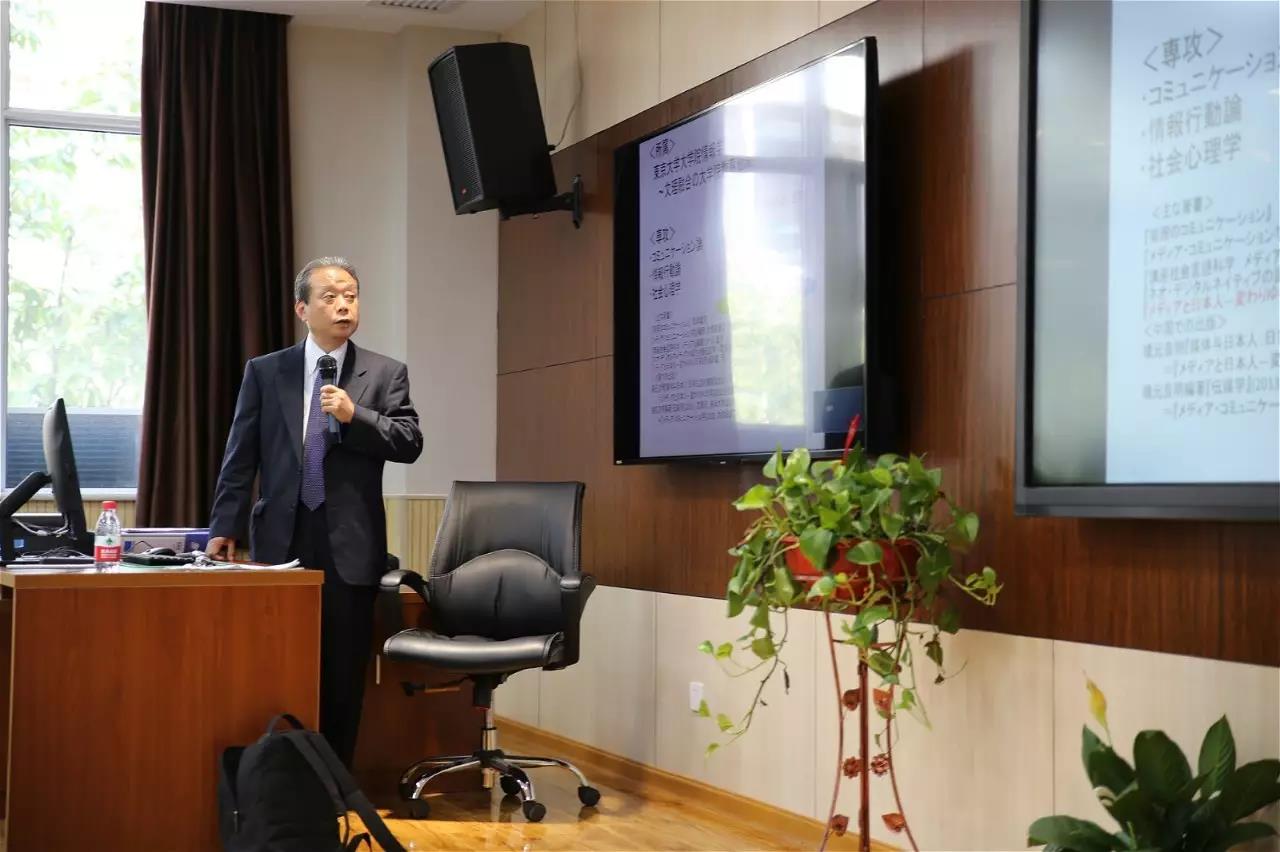 讲座正式开始后,桥元良明教授向大家展示了一些他的著作,并详细介绍了关于“媒体社会心理学”的四大因素:社会生活、心理、信息、媒体。并强调这四者之间有着紧密的联系。