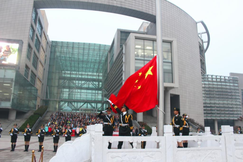 七点三十分,迎着朝阳,国旗护卫队成员迈着铿锵的步伐来到国旗台下,全场一片肃静。在激昂的《义勇军进行曲》中,升旗手振臂一挥,鲜艳的五星红旗徐徐展开,在初升朝阳的映照下,全场师生的注目中迎风飘扬。