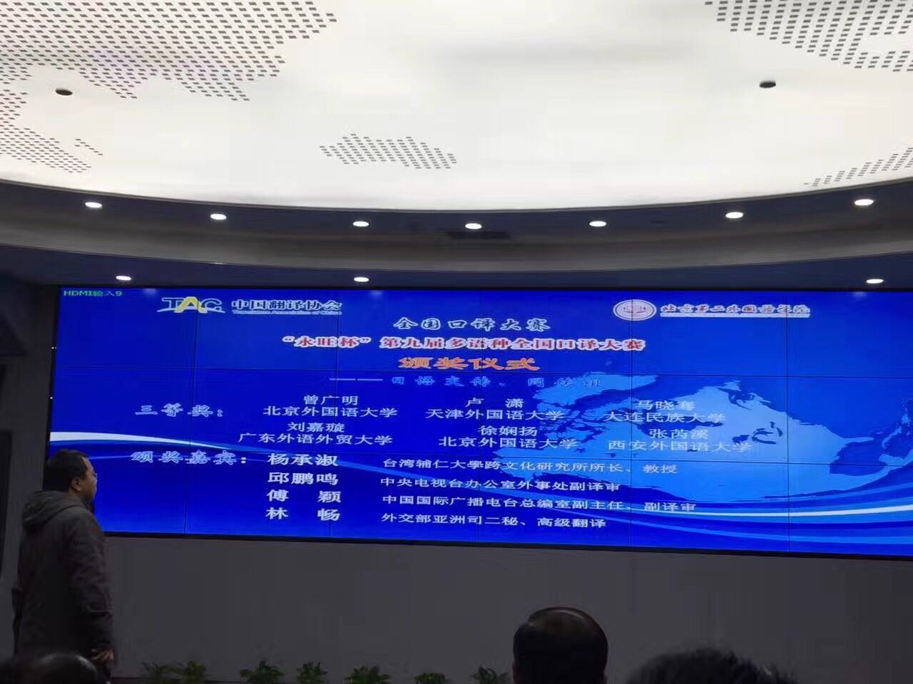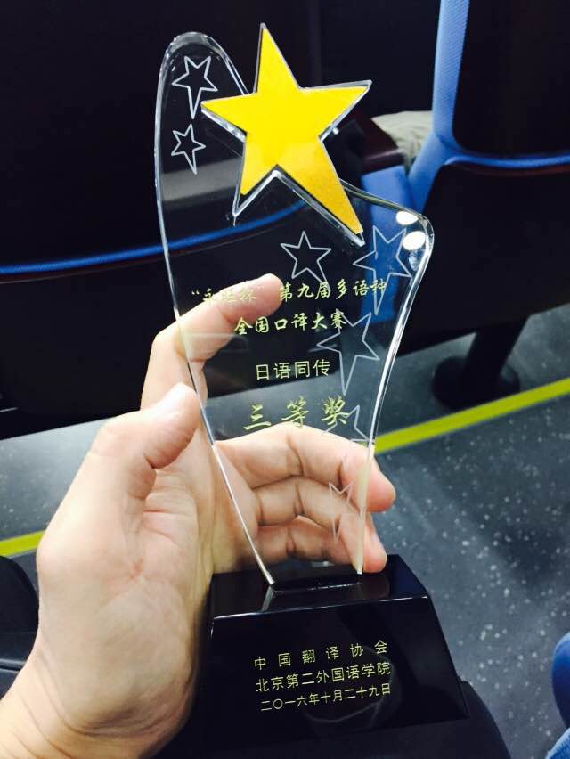 2016年10月29日在北京第二外国语学院举办的第九届大赛中,我校MTI日语口译方向二年级的张芮溪同学和三年级的王丹同学分别参加了日语同传组和交传组的比赛,并取得了优异的成绩。
