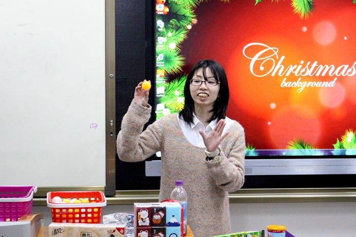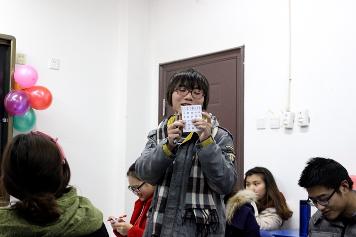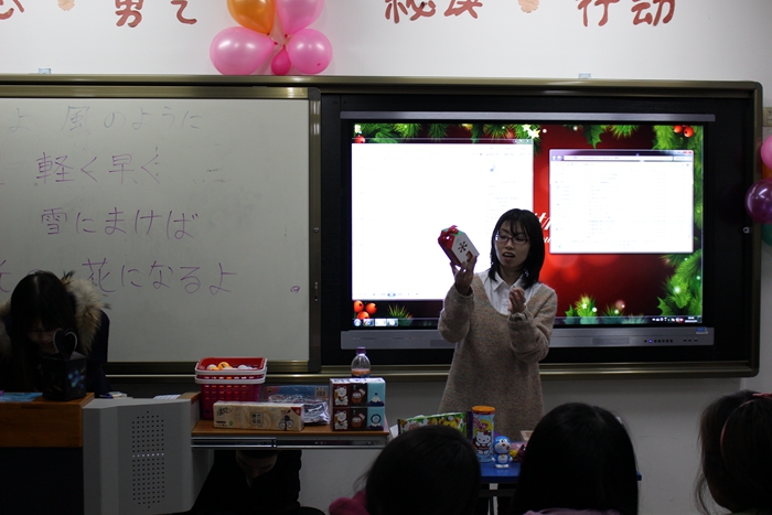 为营造欢快的圣诞节气氛,山田周老师给大家带来了一棵用各色水果做成的特殊“圣诞树”,红、白、绿相间的圣诞树,承载着老师对学生们满满的祝福和关爱。宫本阳佳老师则带领大家一起学习日语版的圣诞歌,轻快悦耳的歌声一遍一遍回响在我们的耳边,浓浓的圣诞情围绕在每一个人的心头,久久不能散去。之后,老师带领在场的学生玩起了名叫“Bingo”的连线游戏,在山田周老师每次抽球之后,每个同学需要把手中纸片上的数字圈画起来,最后连成一条直线,首先连线成功的人可以从老师手中得到一份珍贵的小礼物,看似简单的游戏大大鼓舞了同学们学习的热情,每一个人都斗志昂扬,信心满满地投入到游戏中去。随着一轮轮获奖人数的增多,本次日语角活动也走入了尾声,时间在不知不觉中流逝,但那一份快乐会一直留在大家心中,老师们的心意深深感染了在场的每一位同学。