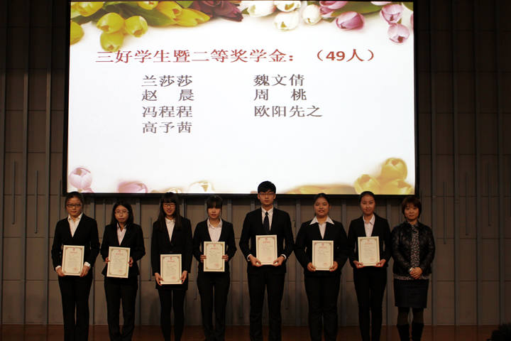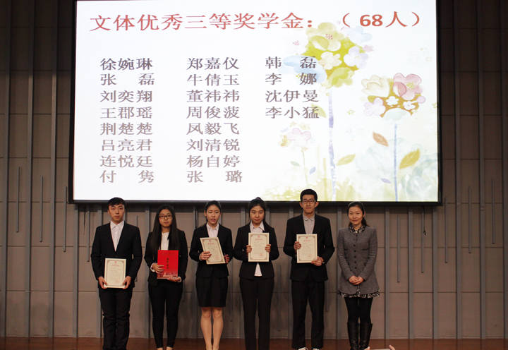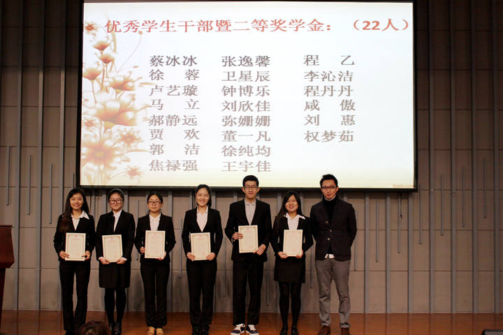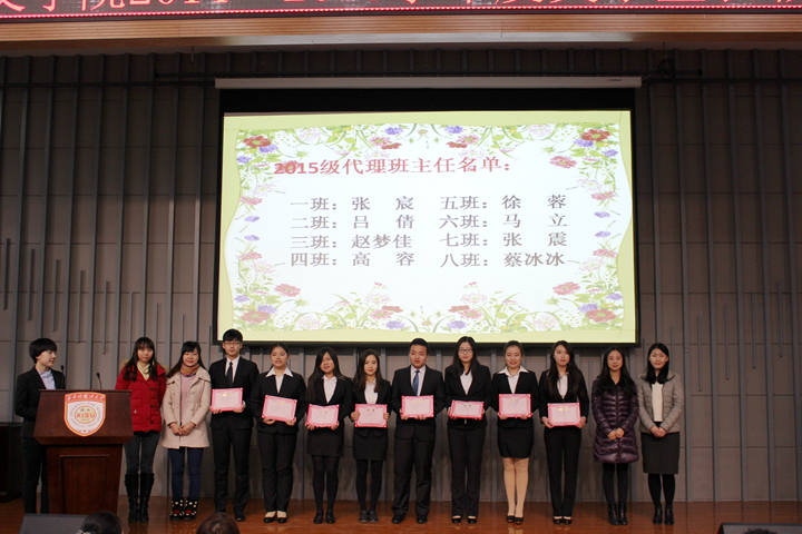 颁奖仪式在庄严肃穆的国歌声中拉开帷幕。首先,院长孙敦夫发表致辞,他在肯定了同学们优秀表现的同时,勉励同学们以本次颁奖大会为契机继续努力,把获得的荣誉作为鞭策自己不断前进的动力,努力做到爱国、勤奋、博学、创新,成长为新世纪的优秀人才。之后,党委书记李敬先宣读了表彰文件及2015级代理班主任任命书,并对获奖同学表示祝贺。优秀学生代表李中慧同学在发言中表达了自己对学院悉心栽培的感谢,并鼓励在场的同学努力学习,全面发展,让自己努力成为对国家对社会有用的人。随后,由孙院长为获得国家励志奖学金的同学颁奖;李书记为获得先进班集体称号的班级颁奖;毋育新副院长以及吴少华副院长分别为获得三好学生标兵暨一等奖学金以及三好学生暨二等奖学金的同学颁奖;韩思远老师为优秀学生干部暨二等奖学金的同学颁奖;王琰老师为三等奖学金的同学颁奖;段笑晔老师为文体三等奖学金的同学颁奖;各级辅导员为全体代理班主任颁发聘书。会后,全体师生合影留念。