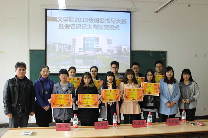 11月12日中午,百合漫画 2015级假名书写大赛暨假名识记大赛颁奖仪式在JA106举行。本次大赛由教研室主办,学生会学习活动部协办。毋育新副院长,段笑晔老师,许敏老师等出席了本次颁奖仪式。颁奖开始前,毋育新副院长发表致辞,向到场的老师及学生分享日语书写在生活中的重要性及其对以后生活和工作的影响,鼓励大家认真对待日语学习。