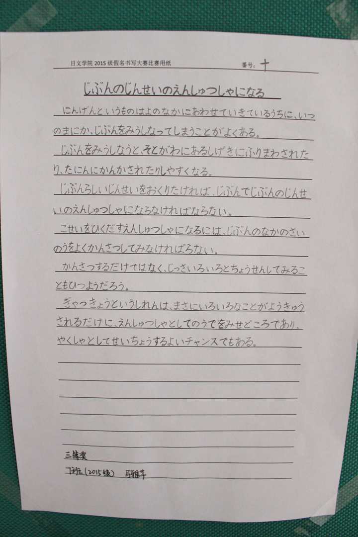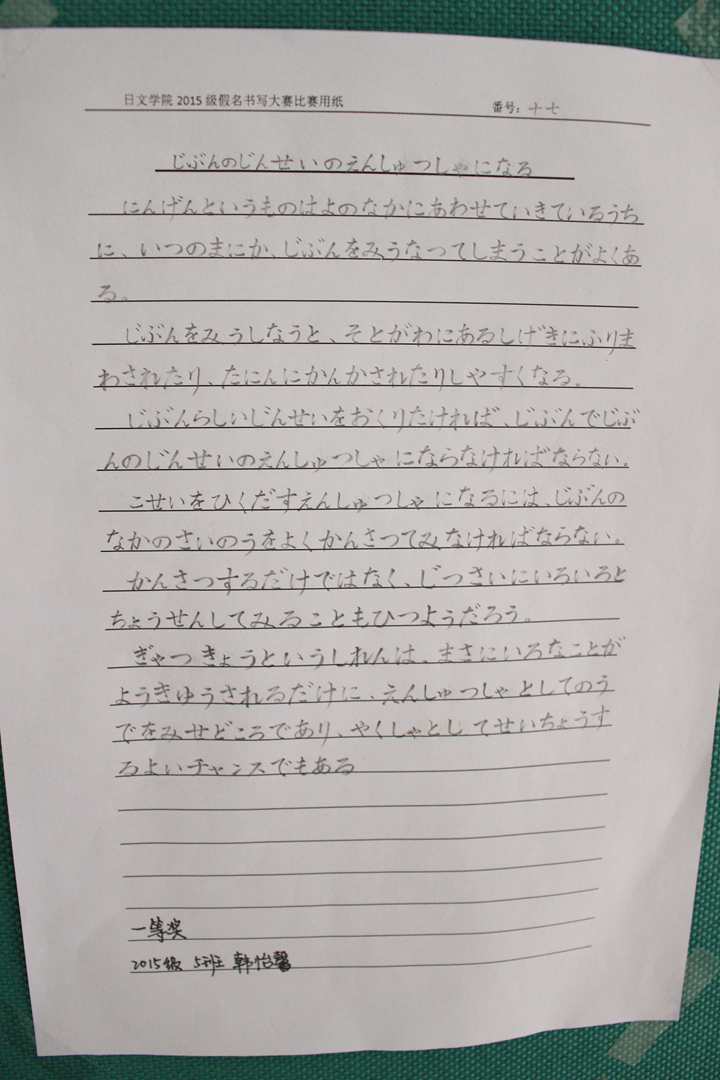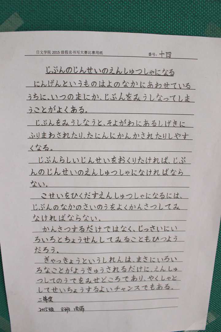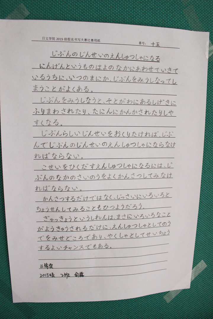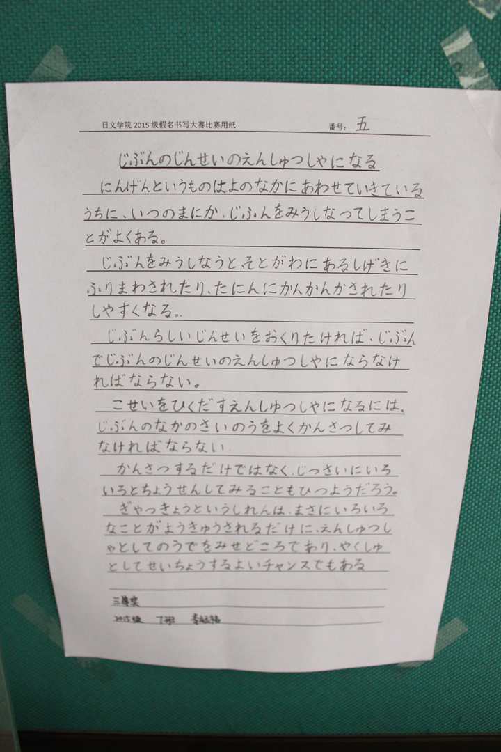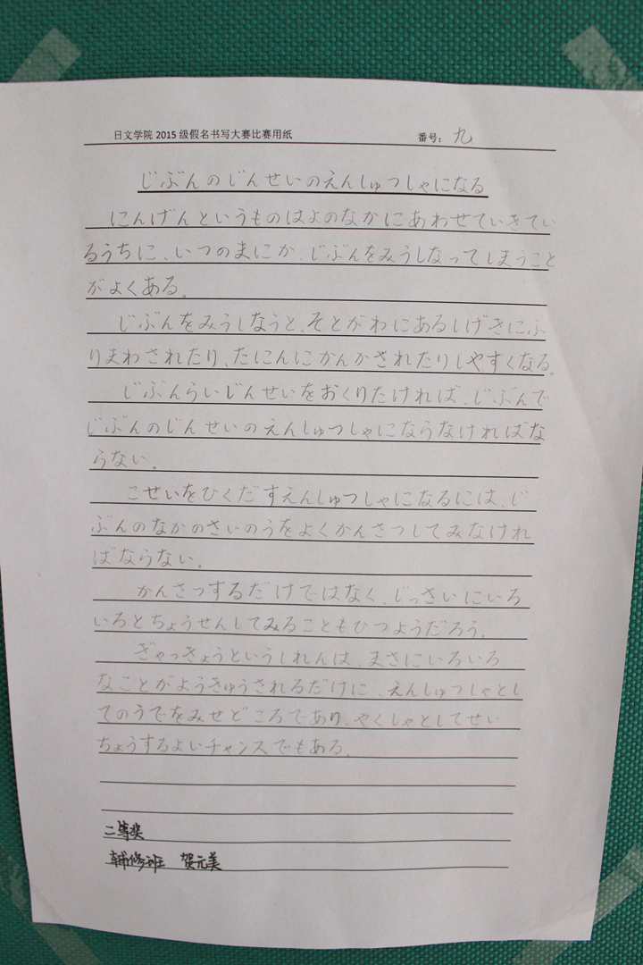 另外,2015级全体学生参与的假名识记大赛是对学生学习生活的一次检测,每位学生都认真复习,以凭借优异的成绩在本次比赛中脱颖而出。经过老师们的反复评比,最终5班徐杰和2班俞露获得一等奖;7班向梦涵获得二等奖;2班王昇、5班葛慧琳及8班李佳隆获得三等奖。
