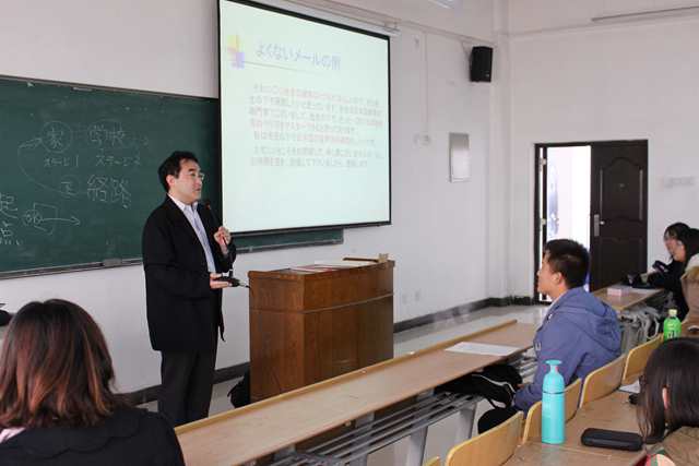 讲座中,杉村泰老师首先介绍了中日学生对于日语格助词与动词的掌握情况,用统计对比图分析了中日学生在语言学习上出现的问题,并提出了有效的解决方案。随后,杉村泰老师例举各种生动有趣的实例向同学们讲解了格助词与自他动词的使用方法及语法难点。最后,杉村泰老师与同学们互动交流,详细地向同学们介绍了赴日留学的注意事项,并就赴日考研给予了参考意见。