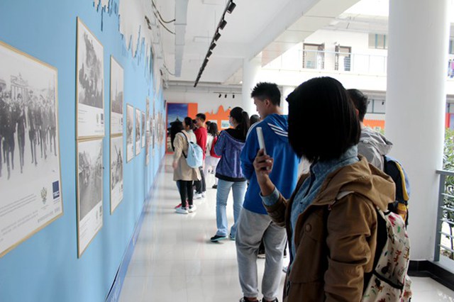 此次图片展的展板一边是具有浓郁俄罗斯风情的著名红场建筑剪影,另一边是以纪念抗战胜利70周年为主题的图片系列展览。展馆中,绿植鲜花与展墙图片相映成趣,同学们或三五成群,或独自观赏。会场通过展板静态展示,讲述了中国人民抗战的历史发展脉络、重大事件以及英雄人物事迹,全面回顾了人民抗战的光荣历史,充分激发了同学们的爱国主义情感,增强了爱国之情,坚定了报国之志。通过对俄罗斯副总理来访会场的参观,同学们充分了解了中俄两国睦邻友好和稳固发展的交往史,同时也通过图片展示,回顾了我校自建校以来与俄罗斯友好关系的悠久历史。 参观活动结束后,同学们纷纷表示,70年后的今天,青年学生积极参与到纪念抗日战争伟大胜利的活动中来,就是要铭记历史、缅怀先烈、珍爱和平、开创未来,为实现中华民族伟大复兴中国梦贡献自己的力量。谈及对此次俄副总理的来访,同学们认为这不仅是对我校办学实力的充分肯定,也是属于每一位西外人的极大光荣。活动在和谐轻松的氛围下圆满结束。