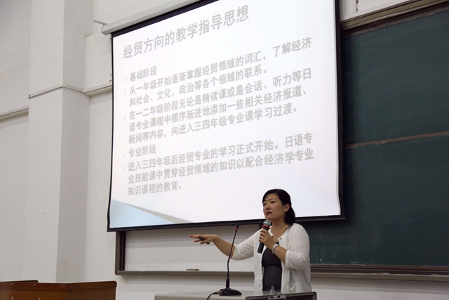 接着,韩思远、陈曦和王琰老师分别对三个方向做了详细说明。韩老师介绍到翻译方向的培养目标是致力于打造听、说、读、写、译全面发展的高端复合型日语人才。陈老师则强调选择日英复语的同学对语言一定要有发自内心的热忱、不可或缺的抗压能力和刻苦坚持的恒心毅力,最终成为日英双语复合型人才。王老师希望对经贸方向感兴趣的同学们能在熟练掌握日语的同时,学会运用经济学思维去认知事物,增加自身在充满竞争的社会环境中顺利就业的筹码。