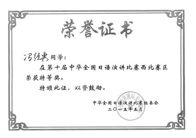 据悉,本次中华全国日语演讲比赛由中国教育国际交流协会、日本华人教授会、日本经济新闻社联合主办,兰州大学承办。是目前国内日语专业规模最大、影响范围最广的一项赛事,全国共分八大赛区举行。我院选手在历届比赛中均表现突出、成绩斐然,本次“特等奖”的获得又一次续写了我院学生在此项赛事中的辉煌战绩。