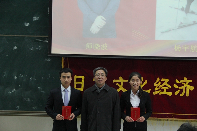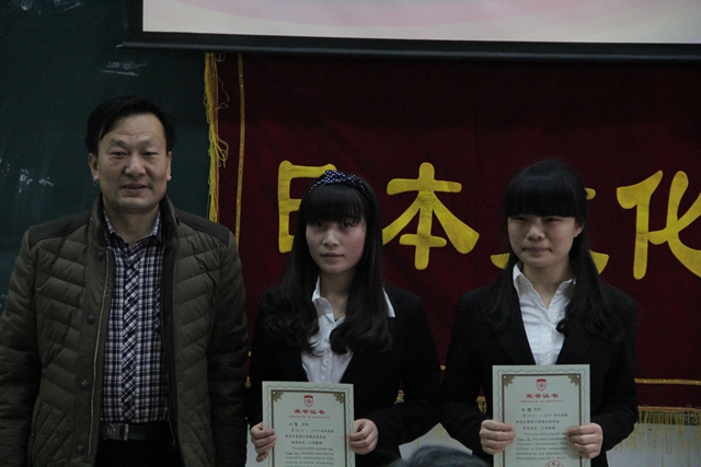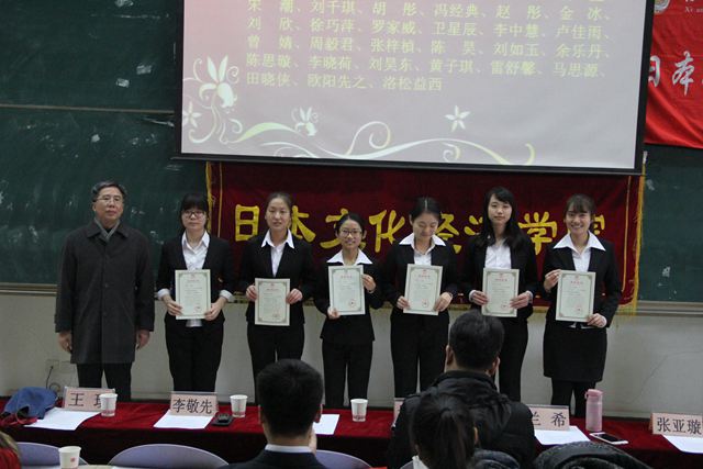 接下来,国家奖学金获得者2011级杨宇航同学作为获奖学生代表上台发言,她代表所有同学对学院领导、老师的栽培和教育表示了感谢,并将自己的学习经验和技巧与到场的同学进行了分享,希望学弟学妹们以积极进取的心态不断努力,创造出日文学院更加辉煌的未来。随后,出席大会的领导依次为学生代表和先进班集体颁发了荣誉证书,并为 2014级代理班主任颁发了聘书。