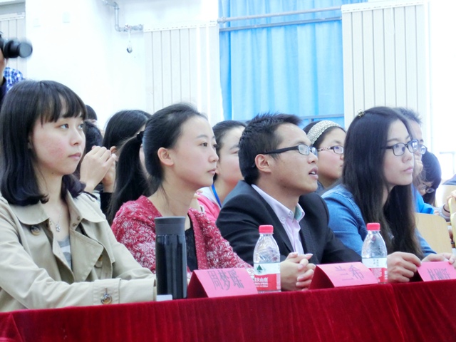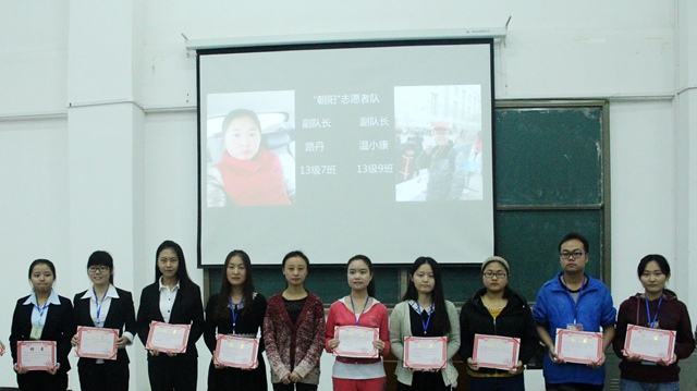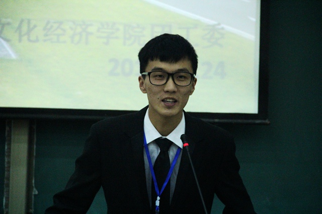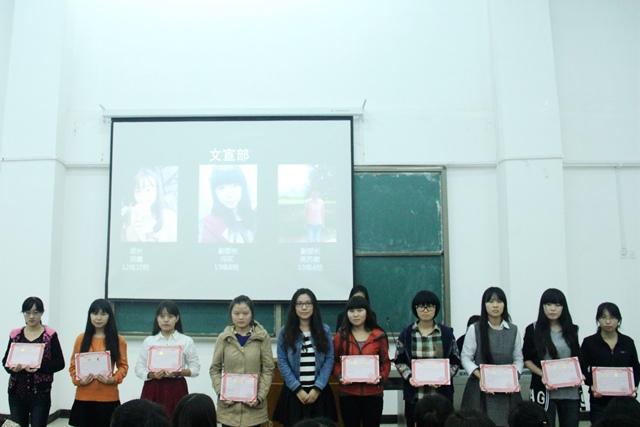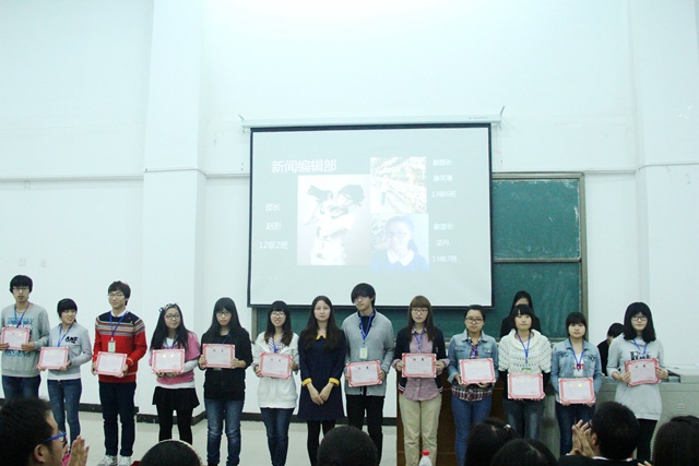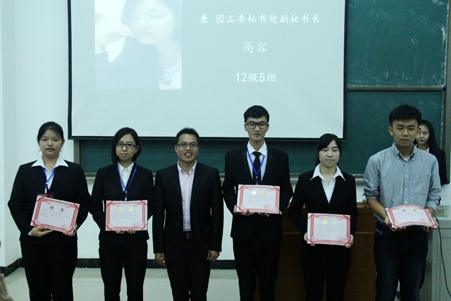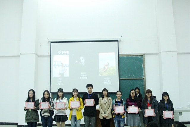 在场的老师和学生们回顾了2013年团工委的活动成果,一张张照片记录着团工委过去一年的丰硕成果,同时也激励新一届的团工委不断进取。在2014级辅导员兰希宣读新任团工委干部任命书之后,各位老师为70余名新一届团工委学生干部颁发了聘书。接下来,团工委秘书长许英杰、团总支书记郭洁、学生会主席杨嘉琛、社团联合会主席徐然、“朝阳”志愿者队长高容分别做了履职演说,以“学长学姐”的口吻向大家分享了他们在团工委的成长历程及对未来的展望。