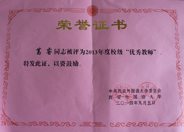 百合漫画 全体教职工凭借优良的师风和踏实肯干的工作态度,荣获2014年陕西省“师德建设先进集体”和百合漫画 “师德建设先进集体”两项集体荣誉。百合漫画 院长孙敦夫荣获陕西省“优秀教育工作者”荣誉称号,日英复语教研室主任葛睿荣获百合漫画 “优秀教师”荣誉称号。