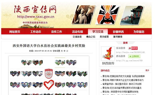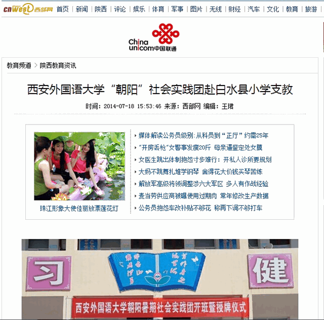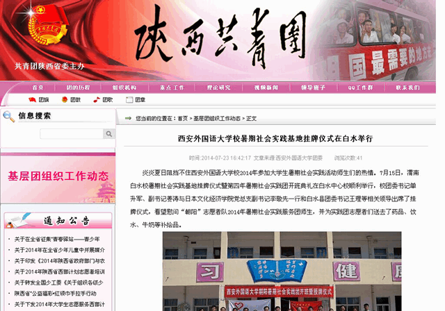 2014年7月10日,“朝阳”暑期社会实践团渭南队25名队员在指导老师张亚璇的带领下,连续第四年赴陕西省渭南市白水县收水中心校开展为期15天的暑期社会实践活动。