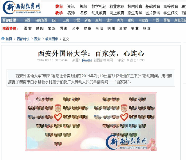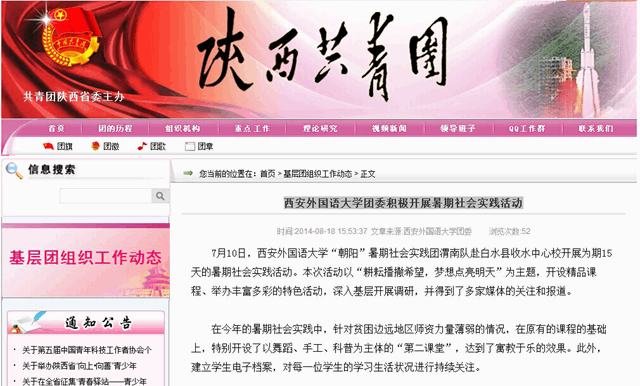 2014年8月7日,“朝阳”品牌的特色课程成功入围了首届全国大学生“三下乡”支教课程设计竞赛的决赛圈,也是西北地区唯一一支入围决赛的高校团队。以下是首届全国大学生“三下乡”支教课程设计竞赛动态链接://sxx.youth.cn/2014kechengdasai/news.shtml