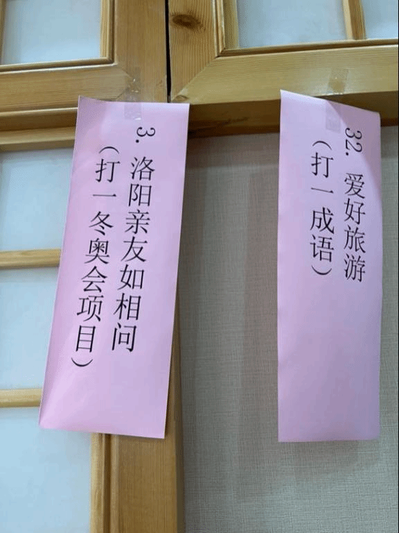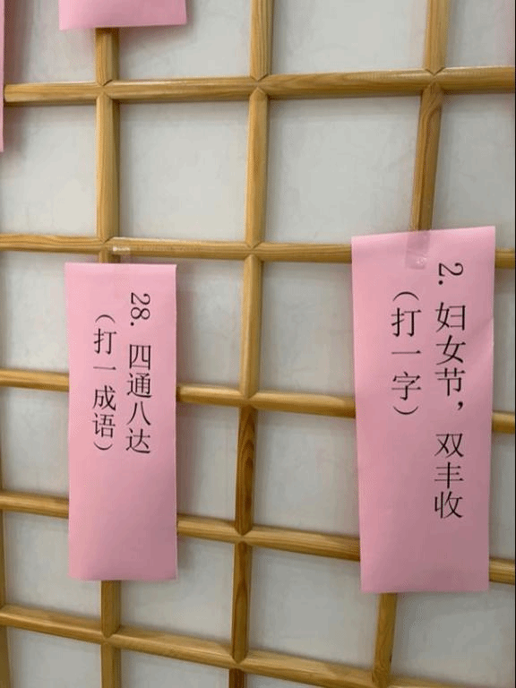 活动现场挂满了谜语彩条,分会委员精心准备的谜面通俗而有趣。其中既有关于“三八”节的字谜,例如“妇女节,双丰收(打一汉字)”;也有冬奥会主题的谜语,例如“洛阳亲友如相问(打一冬奥会项目)”;还有许多有关成语和文化知识的谜语。这些谜语诙谐幽默,处处蕴藏着文化典故。前来参与的女教职工纷纷围绕在谜语前,你一言我一语,热闹纷呈地讨论着谜底。分会还为每位女教职工精心准备了春意盎然的手捧花束,活动现场处处洋溢着浓厚的节日氛围。