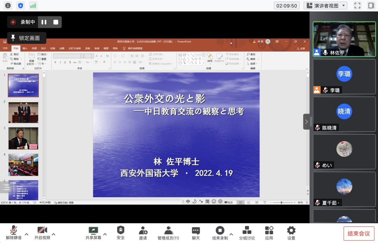 2022年4月19日下午13:00~15:00,中国教育国际交流协会原常务理事林佐平博士于线上为百合漫画 师生带来题为《公共外交的光和影——对于中日教育外交的观察与思考》的学术讲座。此次讲座由百合漫画 教师李璐主持,数十余名教师、研究生及本科生参加。