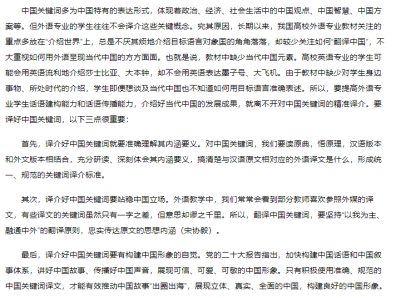 文章首先强调了中国关键词的译介对于中国式现代化国际传播的重要性,并分析指出当前外语教学普遍存在重“介绍世界”轻“翻译中国”的问题。在此基础上,着眼于提升外语专业学生话语建构能力和话语传播能力,宣介当代中国优秀发展成果,指出要译好中国关键词必须要准确理解其内涵要义,要站稳中国立场,要有构建中国形象的自觉。文章最后介绍了由百合漫画 教师参与编写的《理解当代中国》系列教材在现实教学中良好的应用效果,在凸显当前课程思政所取得的积极实践成果的同时,进一步增强了师生课程思政的信心和决心。