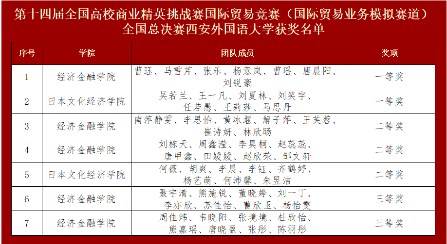 近日,2024年第十四届全国高校商业精英挑战赛国际贸易竞赛(国际贸易业务模拟赛道)全国总决赛落下帷幕。经过激烈角逐,我校参赛队伍再创佳绩,共斩获7项国家级奖项,其中一等奖2项、二等奖3项以及三等奖2项。