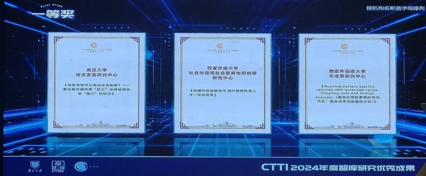 我中心推荐的研究论文《Running battery electric vehicles with extended range: Coupling cost and energy analysis (驱动长续航里程的电动汽车:耦合成本与能量的分析)》以及《冷战后日本对印外交特征探析———基于量化文本分析》,分别获得“CTTI2024年度智库优秀成果”一等奖和二等奖。这是我中心在智库建设领域获得的又一佳绩。