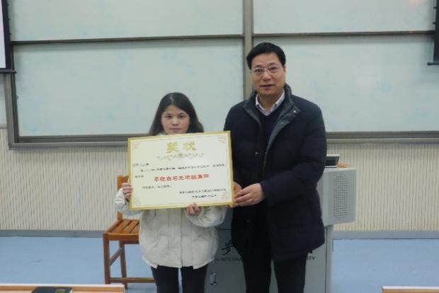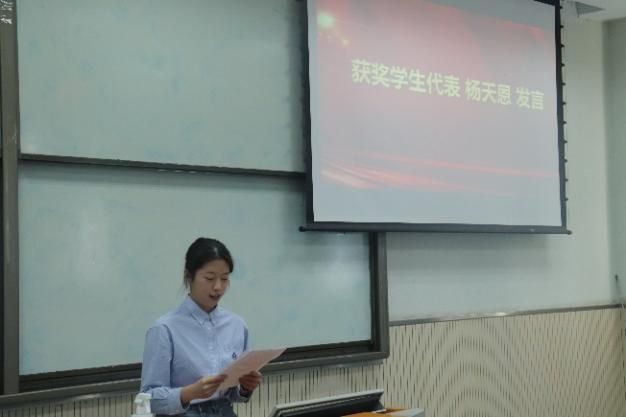杨天恩代表获奖学生交流发言,从多个方面回顾了自己入学以来的成长经历,坚信没有横空出世的幸运,只有不为人知的努力,倡议同学们把握当下,奋发作为。