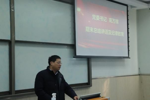 高万辉进行期末总结讲话,通报了2024级本学期开展的各项工作和系列活动,肯定了取得的成绩,指出了下学期努力的方向,并围绕安全稳定、诚信考试、校规校纪等方面开展教育,勉励同学们继续努力,再创佳绩。