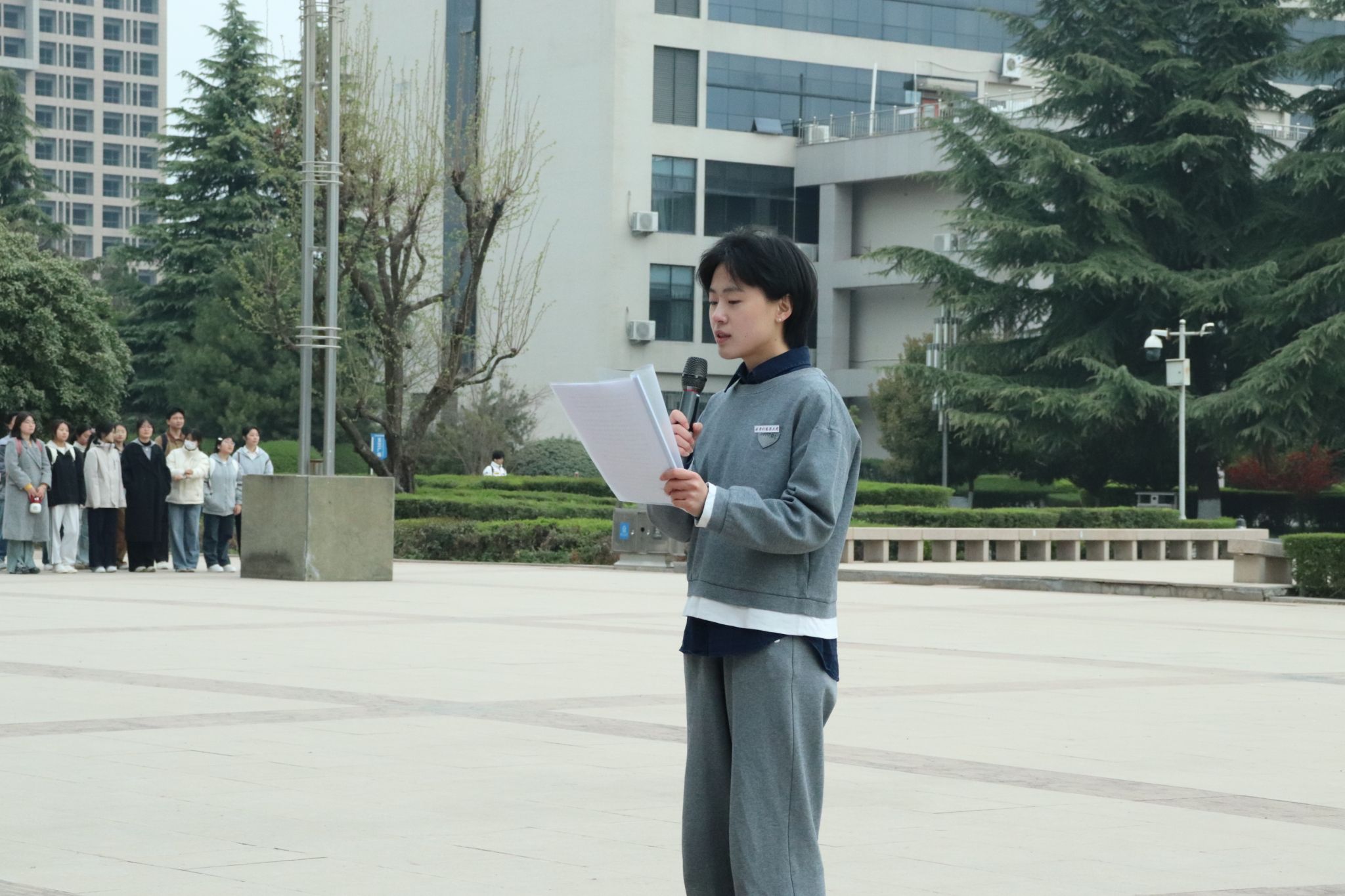 日语专业2023级学生、退伍士兵代俊昊以《以奋斗之我,担时代之责》为题进行了国旗下演讲。他结合自己的军旅生涯,讲述了扎根西北的大漠戈壁,奉献自我报效祖国的故事。他呼吁全体青年学子以“自找苦吃”的韧劲锤炼本领,以“越是艰险越向前”的胆魄迎接挑战,让青春在全面建设社会主义现代化强国的火热实践中绽放绚丽之花。
