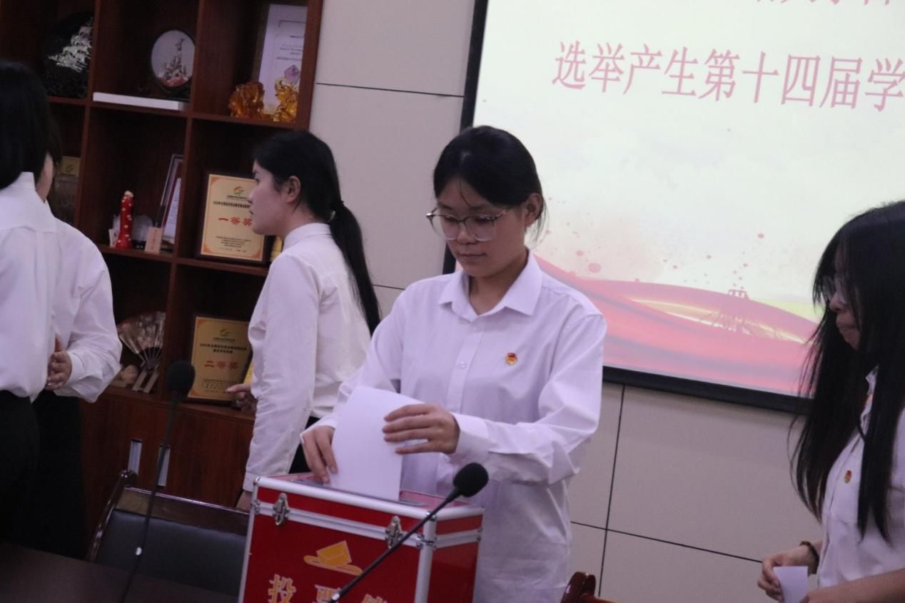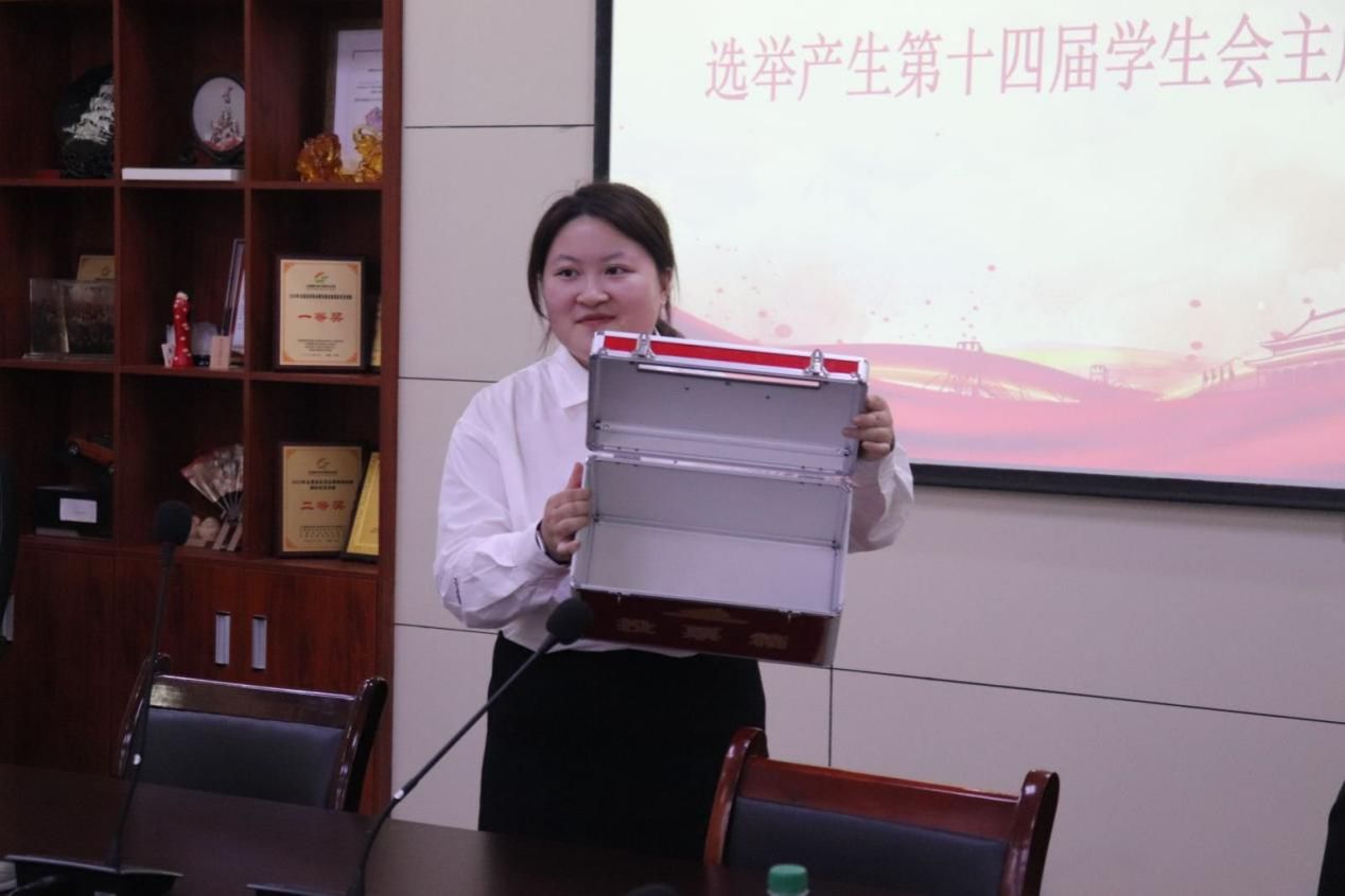 学院团委书记屈晶晶介绍了第十四届主席团候选人情况。在庄重的气氛中,大会以无记名方式进行了新一届学生会主席团成员和校学代会代表投票选举工作,学生代表们依次进行投票。