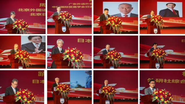 此外北京外国语大学日语学院院长、北京日本学研究中心主任 周异夫教授、广东外语外贸大学日语语言文化学院名誉院长、中国国际贸易学会日语与国际商务专业教学研究委员会主任委员陈多友教授、日本前东京都知事、前厚生劳动大臣舛添要一先生(中友服(北京)教育科技集团有限公司总经理、北海道文教大学客座教授宝虎先生代读)、日本京都府知事西胁隆俊先生(日本NPO法人教育国际交流协会理事长大元守先生代读)、日本京都市市长松井孝治先生(日本株式会社内田洋行监察、NPO法人教育国际交流协会事务局长高井尚一郎先生代读)、日本京都外国语大学校长小野隆启教授、日本北陆大学校长东风安生教授、日本北海道文教大学校长渡部俊弘教授、日本武藏大学副校长踊共二教授、国际教养大学校长蒙特·卡西姆教授(国际教养大学伊东祐郎教授代读)、日本株式会社内田洋行董事长大久保升先生、外研社综合语种教育出版分社副社长杜红坡先生依次上台致辞,对学院五十周年庆典表示祝贺,同时为学院未来发展送上祝福。