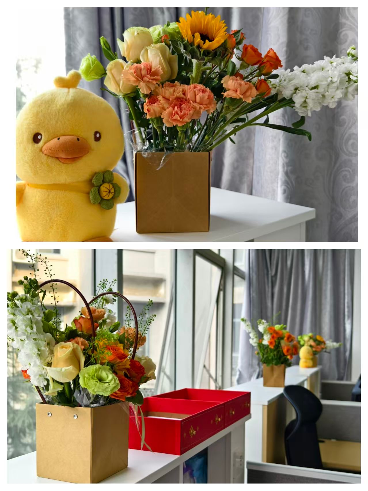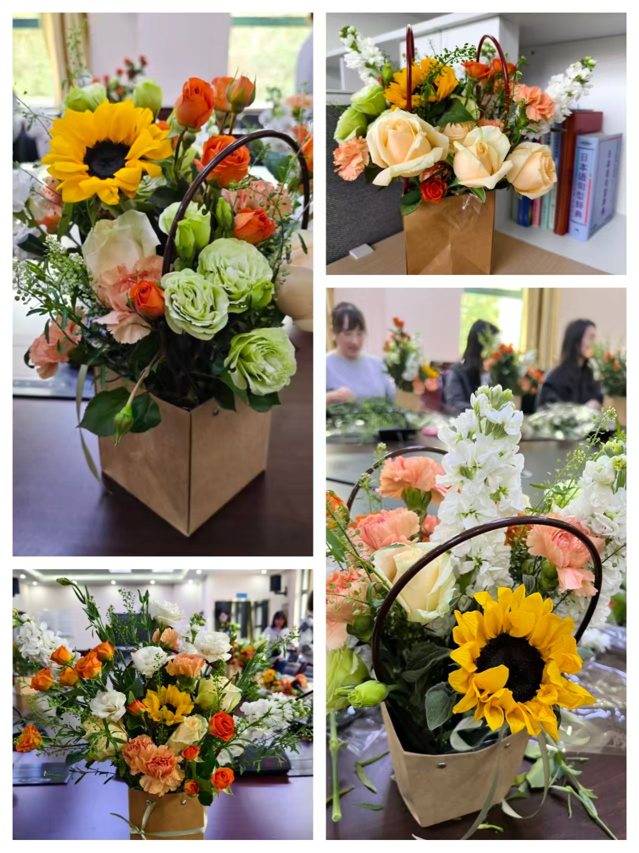 本次花艺活动特别邀请学院赵小宁、赵心僮两位老师做现场指导。她们拥有丰富的花艺经验和深厚的美学素养,从造型设计、色彩搭配到选材修剪为老师们做出细致讲解与示范。现场花香四溢、气氛轻松,大家兴致勃勃地投入创作,一件件独具匠心的花艺作品相继诞生。同时,段笑晔、黄露两位老师代表学院参加校工会“暖风催新绿,巾帼绽芳华”植树活动,为校园增添一抹新绿。