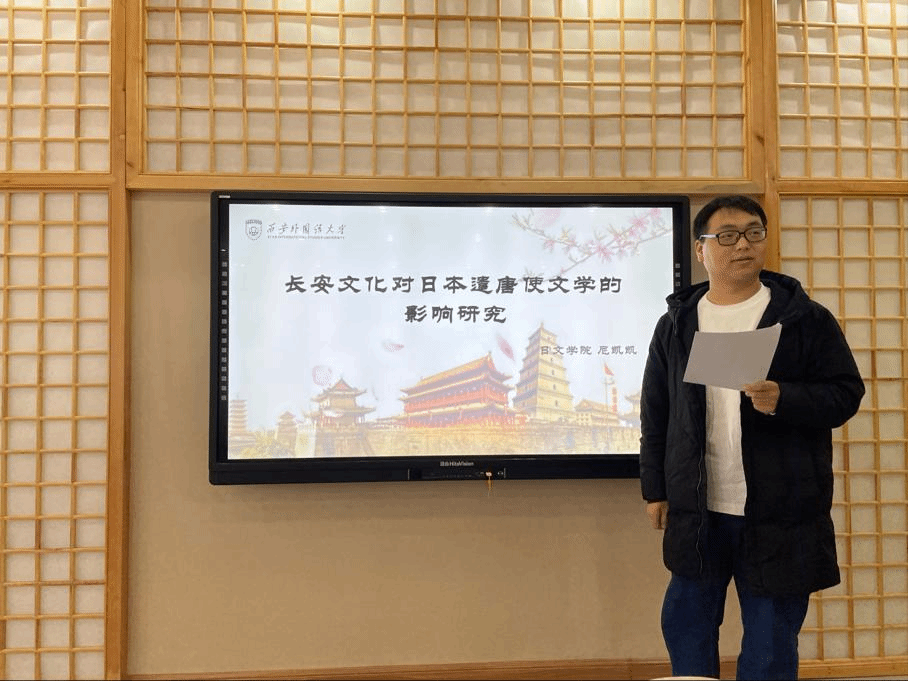 尼凯凯同学以学术论文《长安文化对日本遣唐使文学的彯晌研究》为主题,进行了演讲。他从家园情怀、悲心仁心、文化传播三大主题入手,论证了遣唐使回到日本后所作的诗文作品中呈现了唐代长安所接受的儒佛思想与神道信仰相互融合的特点,在文学创作中表现出三元化思想倾向。