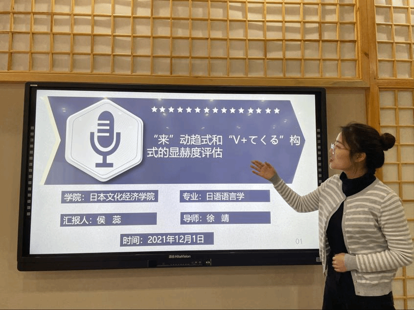 侯蕊同学则以论文《“来”动趋式和"V+てくる"构式的显赫度评估》为主题,进行了演讲。通过分析例句,提出了为什么汉日的动趋式会与对方语言内的多个范畴对应的疑问,并在概括总结先行研究的基础上,结合语料库,得出了预期结论。