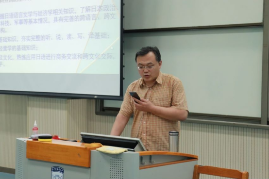 翻译教研室主任韩思远老师为同学介绍翻译方向和师范方向。翻译方向立志于打造听、说、读、写、译全面发展的具备国际视野的高端复合型日语人才。师范方向致力于培养具有优异的教学水平和扎实的日语基础的中学教师!