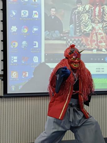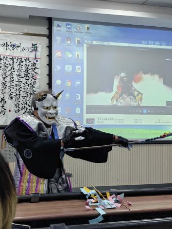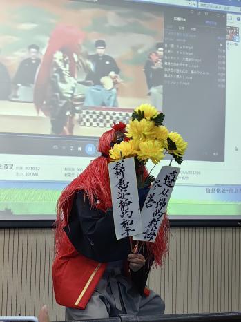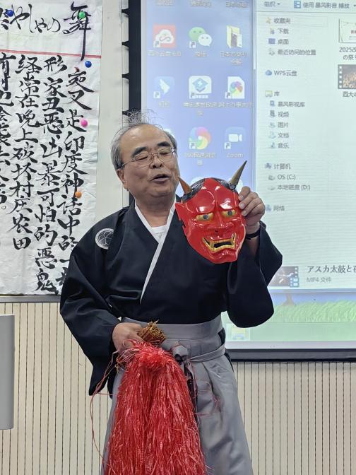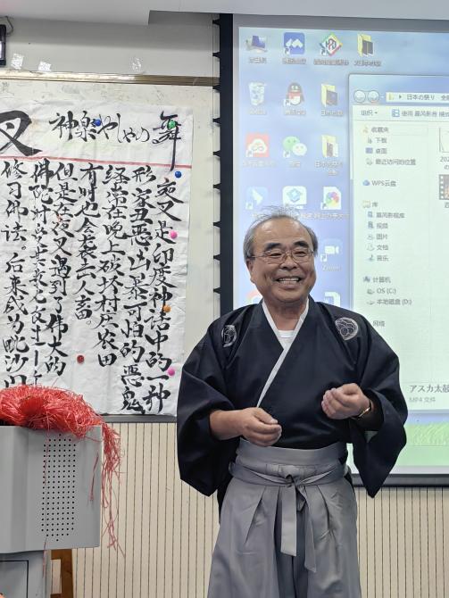 活动最后,田中老师身着传统服饰,为现场同学们献上了精彩的"夜叉舞"表演,他刚劲有力的动作、灵动传神的神态,将现场气氛推向高潮。其精湛的演绎赢得了阵阵掌声,也为本次讲座画上了圆满的句号。