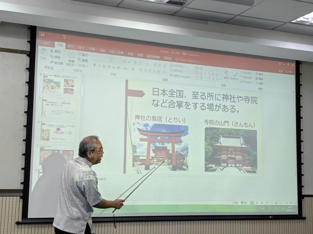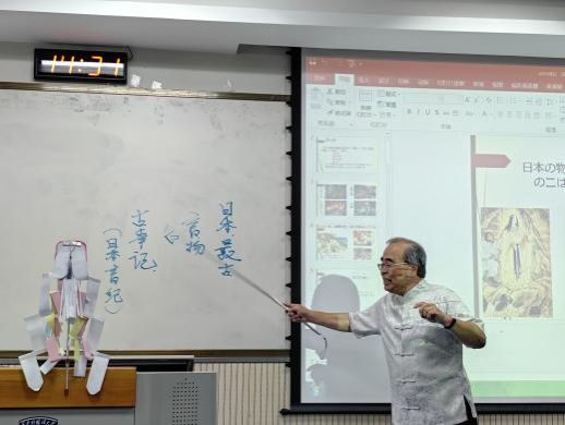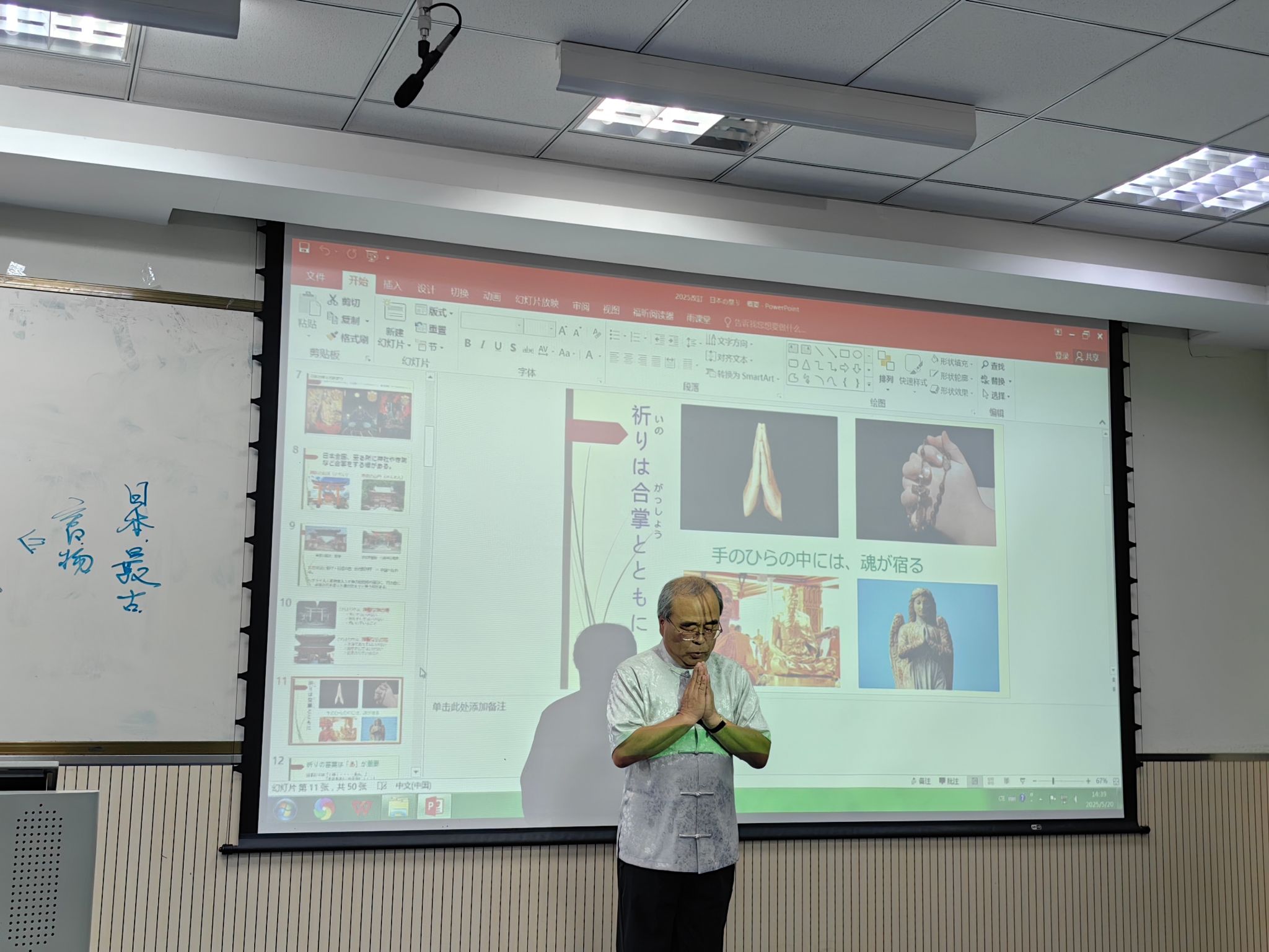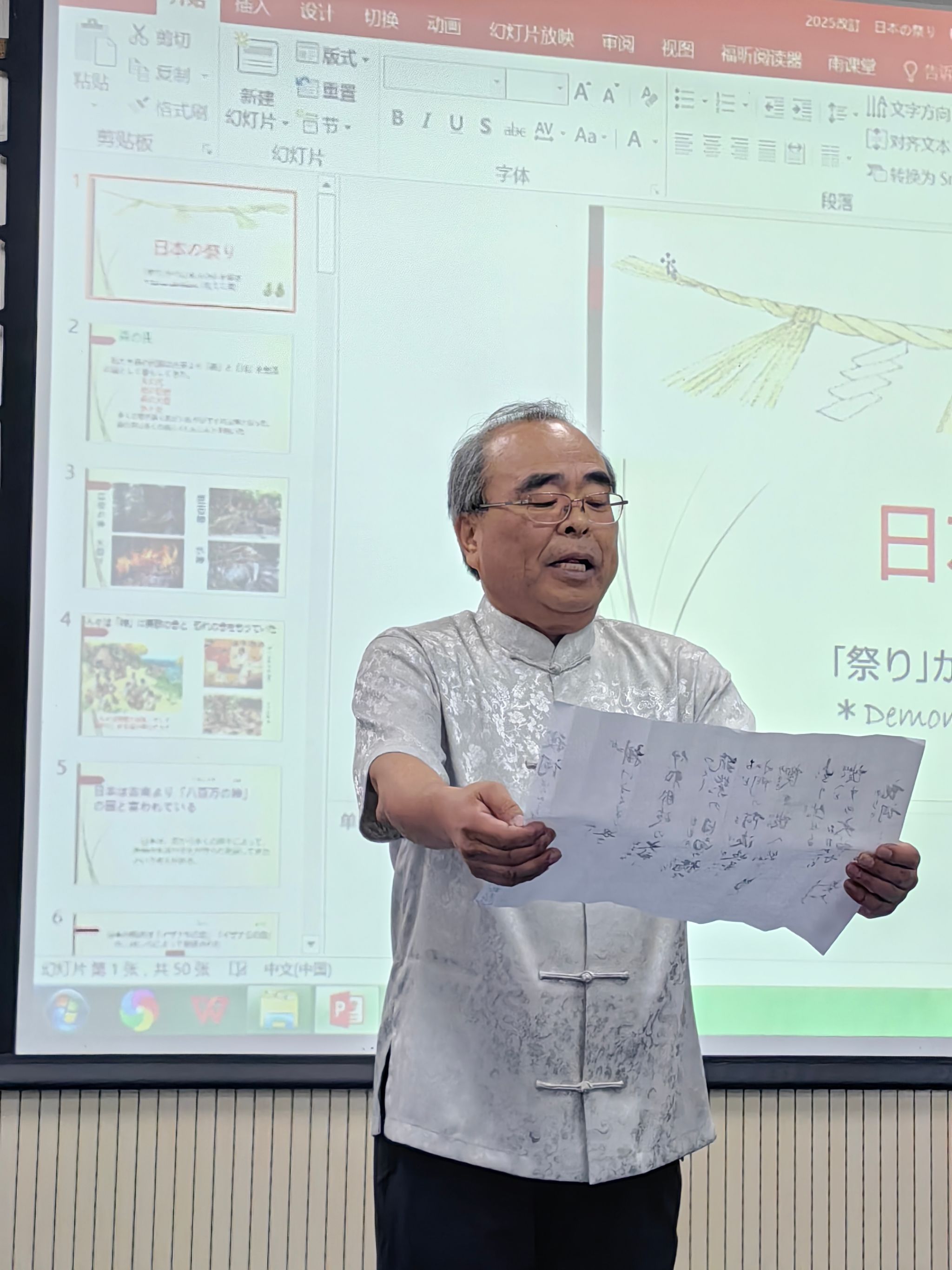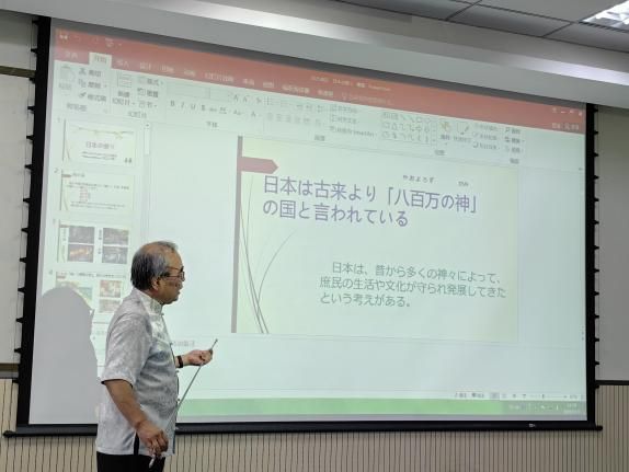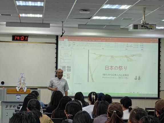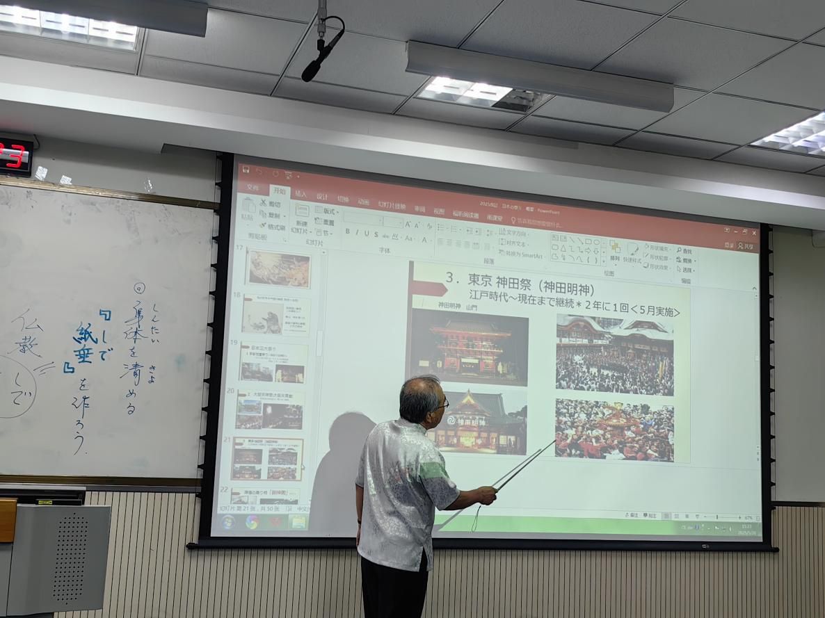 随后,他以《古事记》中的神话传说为切入点,系统讲解了日本神道信仰的起源与发展,重点阐释了鸟居的象征意义及はらえことば(祓词)的文化内涵。同时,他也介绍了日本的神佛信仰与中国的奇妙联系。随后,通过对京都祇園祭、大阪天神祭和东京神田祭等日本的知名传统祭典的详细介绍,带领同学们领略了日本祭典文化的独特魅力。