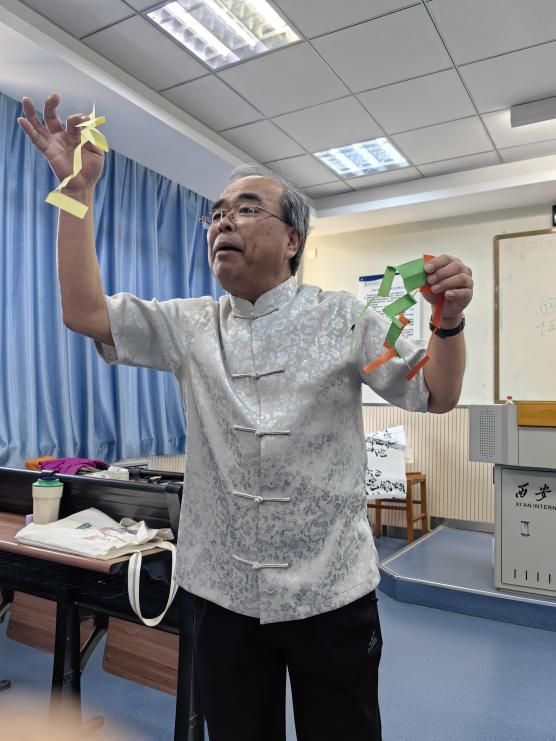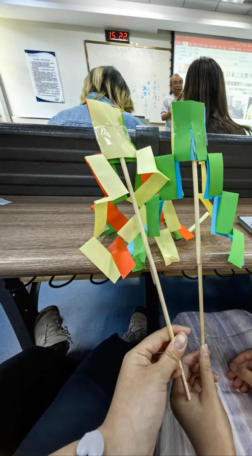 在实践环节,同学们在老师指导下亲手制作了神道仪式用品"しで"。大家用木棍和彩纸进行简单的裁剪和组合,就做成了独具特色的简易版作品。通过动手实践,大家不仅加深了对传统文化的理解,也感受到了日本传统文化的独特韵味。