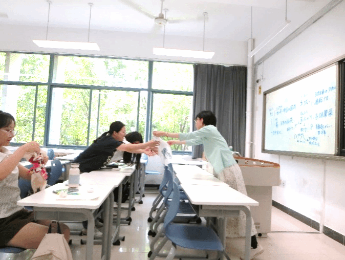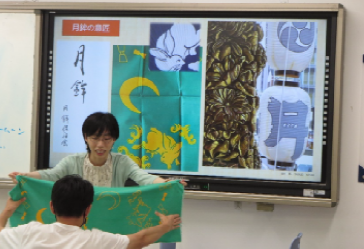 在实物展示环节,香月老师特意向同学展示了祇园祭中常见的传统手工艺品——印有各式山鉾图案的日本手绢。她一边讲解手绢的用途,一边说明不同山鉾设计的文化寓意,吸引了同学们近距离观看与讨论。
