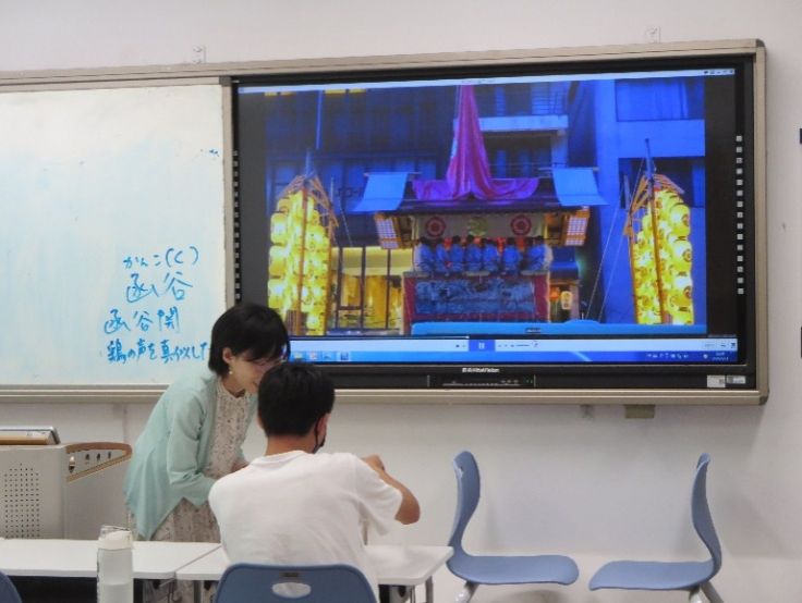 在讲解过程中,香月老师介绍了祇园祭中代表性的“山鉾巡行”,并通过实景视频和图解,帮助同学们理解祭典活动的具体流程与社会参与性。