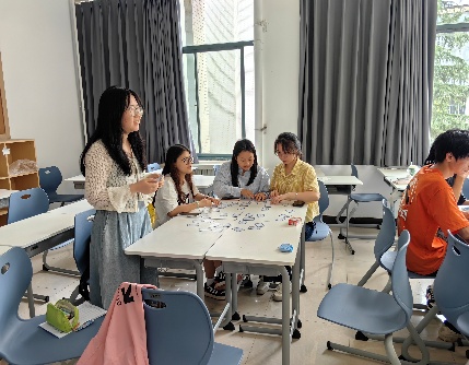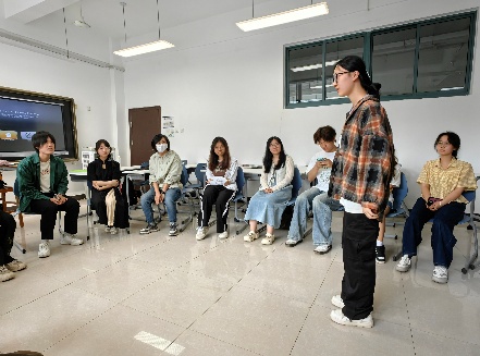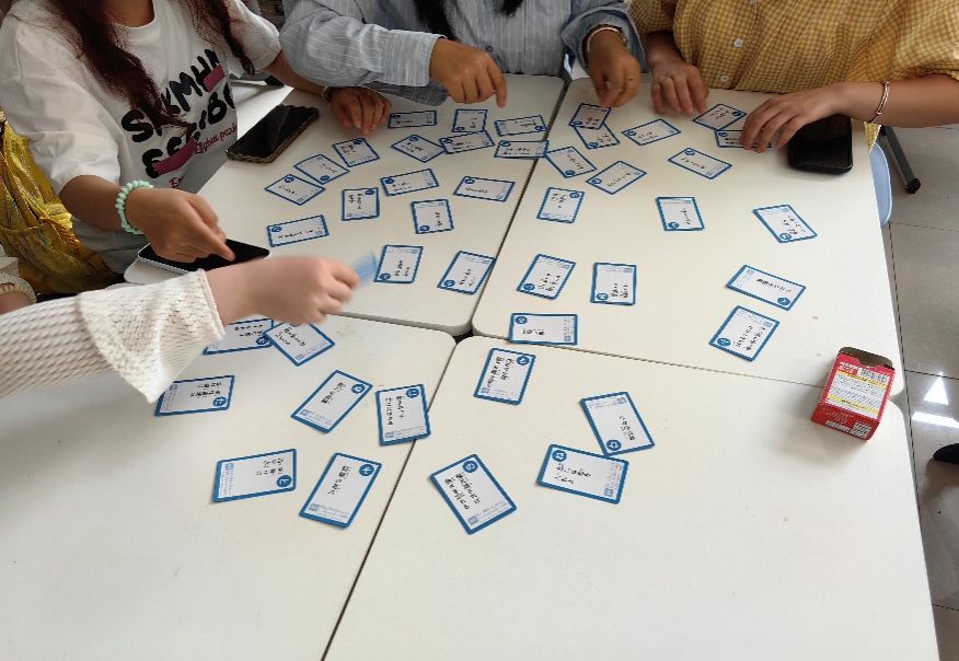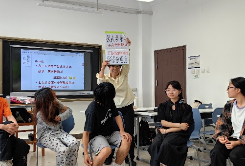 第二环节是改良版“いろはかるた”游戏。 同学们分成6人小组,进行趣味抢牌游戏。菅谷老师准备了写有日语短句的卡片,同学们需快速识别并抢答,正确者得分。游戏不仅考验反应能力,还帮助大家熟悉了日语词汇和表达方式。最终,得分最高的同学赢得了游戏,现场掌声连连。