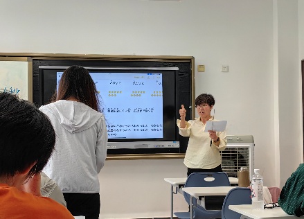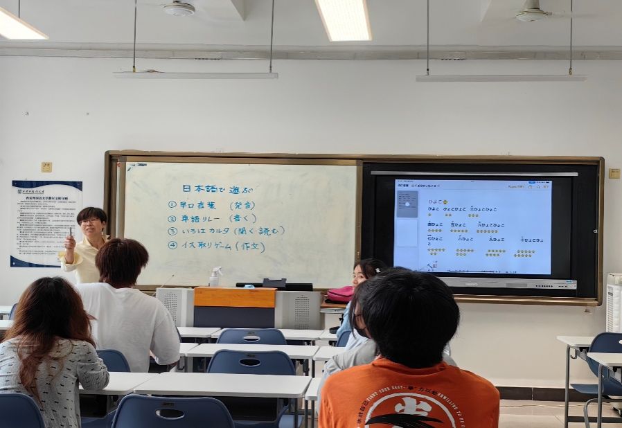 菅谷老师首先示范了经典的日语绕口令,如“ひよこ”“釘”等。同学们在练习后,分组进行接力赛,比拼发音准确度和速度。大家全神贯注,笑声不断,在游戏中锻炼了口语能力。