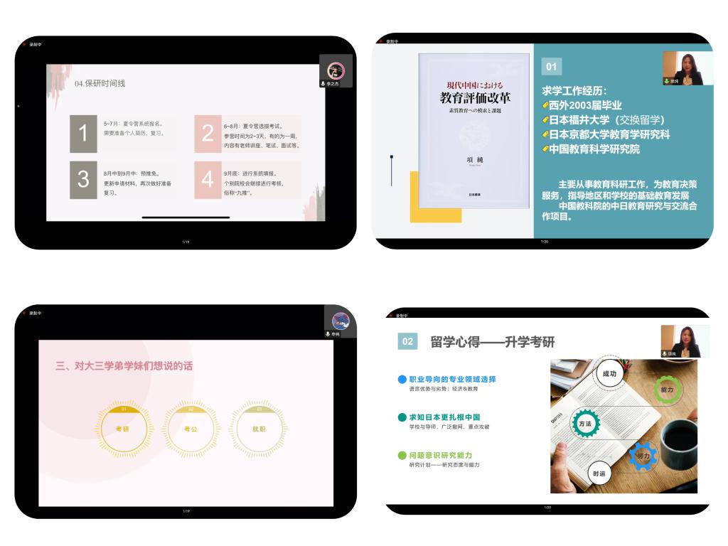 各位校友结合自身实际先后讲述了求学、就职经历和工作感悟,并向学弟学妹们提出了宝贵建议。王荣校友围绕“如何度过大学四年”对各年级同学分别提出学习和生活建议,并带领大家重温了校训“爱国、勤奋、博学、创新”的深层次含义;项纯校友以“最美好的年华遇见最伟大的时代”为题,回顾了自己留学心得和学术科研能力的培养,强调要以扎实的专业学习报效祖国;田雨校友满怀深情地回忆了自己的西外四年美好时光,分享他追逐梦想、扎根新疆、书写别样人生的励志故事;申纯校友讲述了她的求职经历和求职秘籍,并对关于毕业后选择考研还是工作的问题,给出了自己独特的见解;塔拉甫校友结合自身经历,详细介绍了国家公考准备以及要注意的事项,并分享了自己的工作情况和工作体会;李之杰校友生动述说了自己的研究生推免经历,以及参加夏令营、面试等环节的经验。