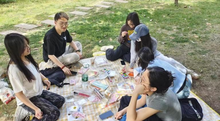 彩绘区里,阳光洒在调色盘上,颜料闪烁着迷人的光芒。同学们或独自沉思,沉浸在自己的绘画世界中;或三两成群,互相交流创作灵感。有人临摹眼前盛开的花朵,将春日的美丽定格在画布上;有人则天马行空地创作抽象画作,用色彩表达内心的情感。一位参与同学笑着说:“好久没有这样专注地做一件事了,画画的时候,仿佛整个世界都安静下来,所有的烦恼都被抛到了九霄云外。” 同学们完成的作品各具特色,但都洋溢着春天的活力与生机,这不仅是对春日的描绘,更是对心灵的释放与放松。